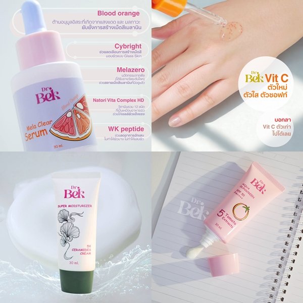 เริ่มขั้นตอนแรกด้วย Dr.Bek Mela Clear Serum (ด๊อกเตอร์ เบค เมลา เคลียร์ เซรั่ม) อุดมไปด้วยสารสกัดจากส้มสีเลือด 3 สายพันธุ์ (Blood orange) ที่มีสารต้านอนุมูลอิสระมากกว่าส้มทั่วไปถึง 9 เท่า ช่วยยับยั้งการสร้างเม็ดสีเมลานินใหม่ ผสานพลังจากสาหร่ายสีรุ้งออร์แกนิก (Cybright) ช่วยลดเลือนจุดด่างดำ เผยผิวหน้ากระจ่างใสแบบ Glass Skin พร้อมด้วย MelaZero (เมลาเซโร) นวัตกรรมสารสกัดจากพืชที่ได้รับรางวัลระดับโลก ช่วยสลายเม็ดสีเมลานินที่สะสมอยู่แล้ว เสริมด้วย WK Peptide (ดับเบิลยูเค เปปไทด์) ช่วยลดการอักเสบของผิว และ Natori Vita Complex HD (นาโทริ วิตา คอมเพล็กซ์ เอชดี) วิตามินรวม 12 ชนิด บำรุงลึกเสมือนเติมอาหารผิวครบ 5 หมู่ ช่วยให้เซลล์ผิวแข็งแรงจากภายใน จำหน่าย ขนาด 30 ml ราคาขวดละ 590 บาท