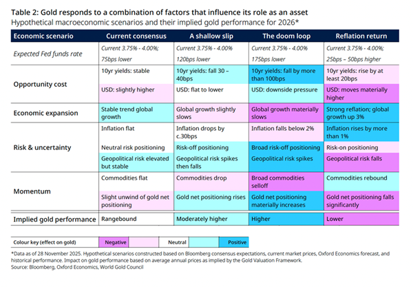 ทองคำได้สร้างปรากฏการณ์อันน่าทึ่งในปี 2568 ด้วยการทำสถิติสูงสุดใหม่กว่า 50 ครั้ง และสร้างผลตอบแทนรายปีเพิ่มขึ้นมากกว่า 60% นับเป็นผลตอบแทนรายปีที่แข็งแกร่งที่สุดตั้งแต่ปี 2514 แม้ว่าการประมาณการของตลาดโดยรวมในปัจจุบันชี้ว่าราคาทองคำจะเคลื่อนไหวในกรอบ (range-bound) แต่ประวัติศาสตร์ได้ชี้ให้เห็นว่าเศรษฐกิจมหภาคมักไม่ได้เป็นไปตามที่ตลาดคาดการณ์ คุณเซาไก ฟาน (Shaokai Fan) หัวหน้าภูมิภาคเอเชียแปซิฟิก (ไม่รวมประเทศจีน) และหัวหน้าฝ่ายธนาคารกลางระดับโลก ของสภาทองคำโลก ได้วิเคราะห์ 3 สถานการณ์สำหรับทองคำ โดยครอบคลุมผลกระทบทั้งในเชิงบวกปานกลาง เชิงบวกสูง และเชิงลบ