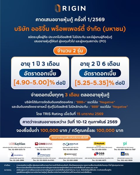 ออริจิ้น พร็อพเพอร์ตี้ คาดว่าจะเสนอขายหุ้นกู้ครั้งที่ 1/2569 จำนวน 2 ชุด อายุ 1 ปี 3 เดือน และ 2 ปี 6 เดือน ชูอัตราดอกเบี้ยระหว่าง [4.90 – 5.35]% ผ่าน 10 สถาบัน เตรียมเปิดขายระหว่างวันที่ 10-12 กุมภาพันธ์ 2569