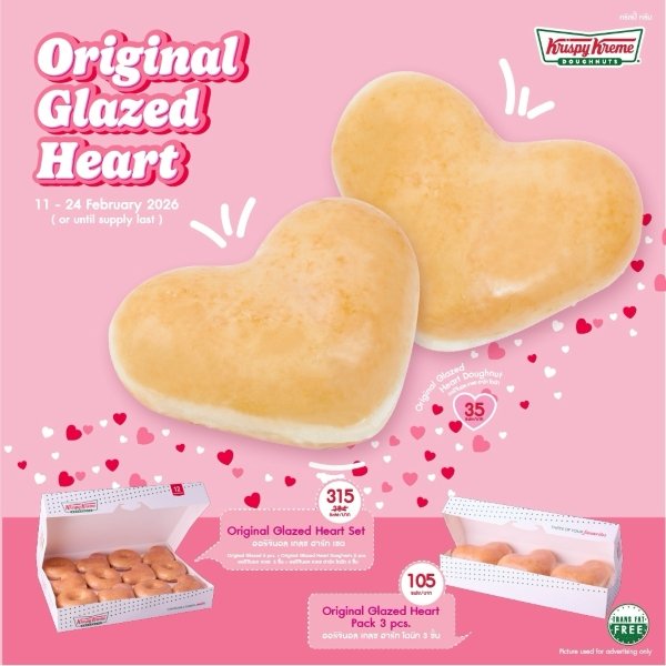เติมเต็มช่วงเวลาแห่งความรักให้มีความหมายมากยิ่งขึ้นกับ “Krispy Kreme Original Glazed Heart Doughnuts” ในราคาเพียง ชิ้นละ 35 บาท หรือจะเลือกซื้อแบบเซตทั้งแบบแพ็ก 3 ในราคา 105 บาท (ออริจินอล เกลซ ฮาร์ท โดนัท 3 ชิ้น) หรือแบบเซต ในราคาเพียง 210 บาท (ออริจินอล เกลซ ฮาร์ท โดนัท 6 ชิ้น) ตั้งแต่วันที่ 11 – 24 กุมภาพันธ์ 2569 ณ ร้านคริสปี้ ครีม ทุกสาขาใกล้บ้านคุณ (ราคาดังกล่าว ยกเว้น สาขาสนามบินสุวรรณภูมิ, สนามบินดอนเมือง และแอปพลิเคชัน ฟู้ดดิลิเวอรี)