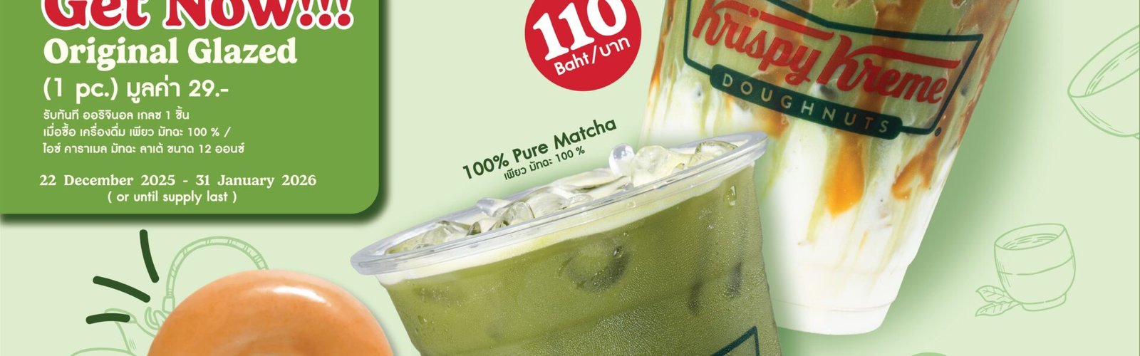 สัมผัสความอร่อยส่งท้ายปี ต้องรับปีใหม่ไปกับ 2 เครื่องดื่มมัทฉะที่หลายคนคิดถึงในราคาเพียง 85 บาท (ขนาด 12 ออนซ์) พร้อมรับสิทธิพิเศษกับโปรโมชั่น Krispy Kreme Perfect Match เพียงจับคู่ความอร่อยของเครื่องดื่ม เพียว มัทฉะ 100% หรือ ไอซ์ คาราเมล มัทฉะ ลาเต้ กับ โดนัทออริจินัล เกลซ เนื้อนุ่ม 1 ชิ้น ในราคาเพียง 110 บาท ตั้งแต่วันที่ 22 ธันวาคม 2568 – 31 มกราคม 2569 ที่ร้านคริสปี้ ครีม ทุกสาขาใกล้บ้านคุณ (เฉพาะสาขาที่ร่วมรายการ ยกเว้น คาร์ท, ฟู้ดทรัค และบ็อกซ์ช้อป)