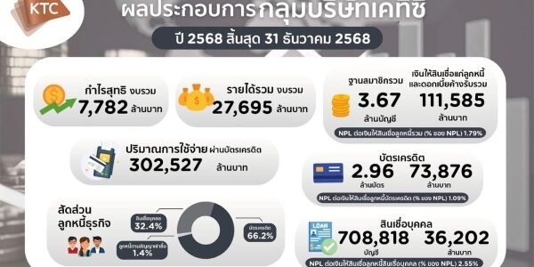 เคทีซีและกลุ่มบริษัทเผยผลประกอบการปี 2568 กำไรสุทธิ 7,782 ล้านบาท เพิ่มขึ้น 4.6% จากปี 2567
