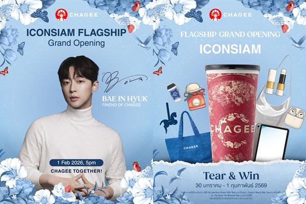 CHAGEE แบรนด์ชาระดับนานาชาติ เตรียมสร้างปรากฏการณ์ครั้งใหม่ในประเทศไทย กับการเปิดตัวจุดหมายปลายทางของคนรักชา “CHAGEE ICONSIAM” แฟลกชิปสโตร์แห่งแรกในกรุงเทพฯ ณ ศูนย์การค้า ICONSIAM ชั้น G โซน The Veranda พร้อมเปิดตัวเมนูใหม่สุดเอ็กซ์คลูซีฟเฉพาะที่ CHAGEE ICONSIAM เท่านั้น และโปรโมชันพิเศษสำหรับงาน Grand Opening ตั้งแต่วันที่ 30 มกราคม ถึง 1 กุมภาพันธ์ 2569 พร้อมเซอร์ไพรส์ครั้งใหญ่กับการปรากฎตัวของซุปตาร์เกาหลีสุดฮอต “Bae In Hyuk” (แบอินฮยอก) ที่จะมาสร้างโมเมนต์สุดประทับใจให้แฟน ๆ สายชา กับกิจกรรม Meet-and-Greet ณ CHAGEE Pop-Up บริเวณลาน River Park ชั้น G ศูนย์การค้า ICONSIAM ในวันที่ 1 กุมภาพันธ์ นี้