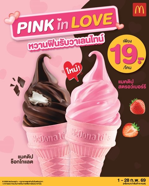 แมคโดนัลด์ ชวนเติมความหวานให้ทุกโมเมนต์ ต้อนรับเทศกาลแห่งความรัก เปิดตัวเมนูใหม่สุดพิเศษ! ‘แมคดิปสตรอว์เบอร์รี’ ไอศกรีมซอฟท์เสิร์ฟ หอมสตรอว์เบอร์รี หวานกรอบละมุน และ ‘แมคดิปช็อกโกแลต’ เข้มข้นเต็มคำ กรอบอร่อยจุใจ เสิร์ฟพร้อม ‘โคนชมพู’ สุดคิ้วท์ ในราคาเริ่มต้นเพียงโคนละ 19 บาท