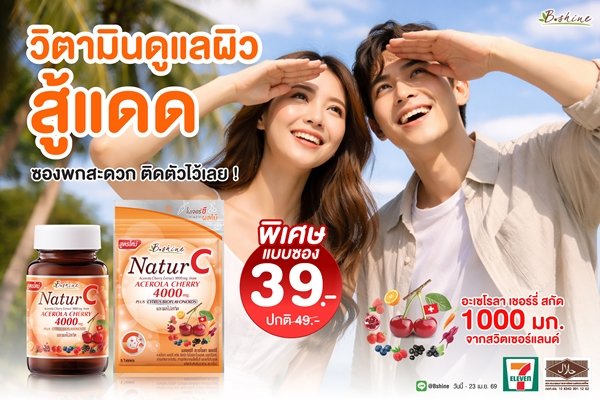 บริษัท บีไชน์ นูทริชั่น พลัส จำกัด ต้อนรับฤดูกาลซัมเมอร์ด้วยโปรโมชั่นสุดพิเศษสำหรับ “บีไชน์ เนเจอร์ซี (B Shine Nature C) สูตรใหม่” วิตามินซีจากธรรมชาติ 100% ช่วยดูแลผิวพรรณให้แลดูสดใส พร้อมเสริมการทำงานของระบบภูมิคุ้มกันให้แข็งแรง แค่วันละเม็ด ในรูปแบบซองพกพา (บรรจุ 5 เม็ด แถมฟรี 1 เม็ด) ราคาพิเศษเพียง 39 บาท (จากราคาปกติ 49 บาท) และสิทธิพิเศษเฉพาะสมาชิก All Member รับส่วนลดเพิ่ม 1 บาท เหลือเพียง 38 บาท ตั้งแต่วันนี้ – 23 เมษายน 2569 ที่ร้านเซเว่น อีเลฟเว่น (7-Eleven) ทุกสาขาทั่วประเทศ