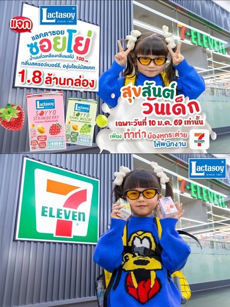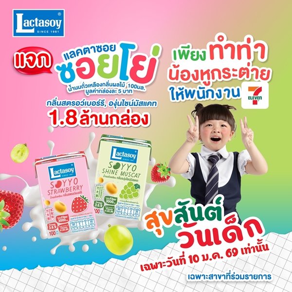 สุขสันต์วันเด็ก แลคตาซอย ใจดี แจกใหญ่ แจกจริง! ส่งความสุขให้เด็กไทยในวันเสาร์ที่ 10 มกราคม 2569 นี้ กับแคมเปญสุดพิเศษมอบ “แลคตาซอย ซอยโย่” นมถั่วเหลืองผสมกลิ่นผลไม้ สตรอว์เบอร์รี่ หวานละมุน และองุ่นไซมัสแคท หอมชื่นใจ ขนาด 100 ml. จำนวน 1,800,000 กล่อง ที่ 7-Eleven เพียงแค่น้องๆ หนูๆ ทำท่า “น้องหูกระต่าย” ชูสองนิ้วไว้ที่หูสองข้างให้พี่พนักงานที่เคาน์เตอร์ดู ก็รับแลคตาซอย ซอยโย่ ฟรีๆ กันไปเลย อย่ารอช้านะ ใกล้ 7-Eleven สาขาไหน รีบพุ่งตัวไปรับความอร่อยและสุขภาพดีกันได้เลย เฉพาะสาขาที่ร่วมรายการ สินค้ามีจำนวนจำกัด 1คน / 1 กล่อง เท่านั้น