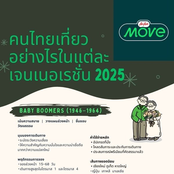 เจาะลึกพฤติกรรมการเดินทางของ Baby Boomers, Gen X และ Millennials ในปี 2025 AirAsia MOVE เผยอินไซท์เชิงข้อมูล ช่วยโรงแรมและสายการบินเข้าถึงนักเดินทางแต่ละเจเนอเรชันได้ตรงจุด